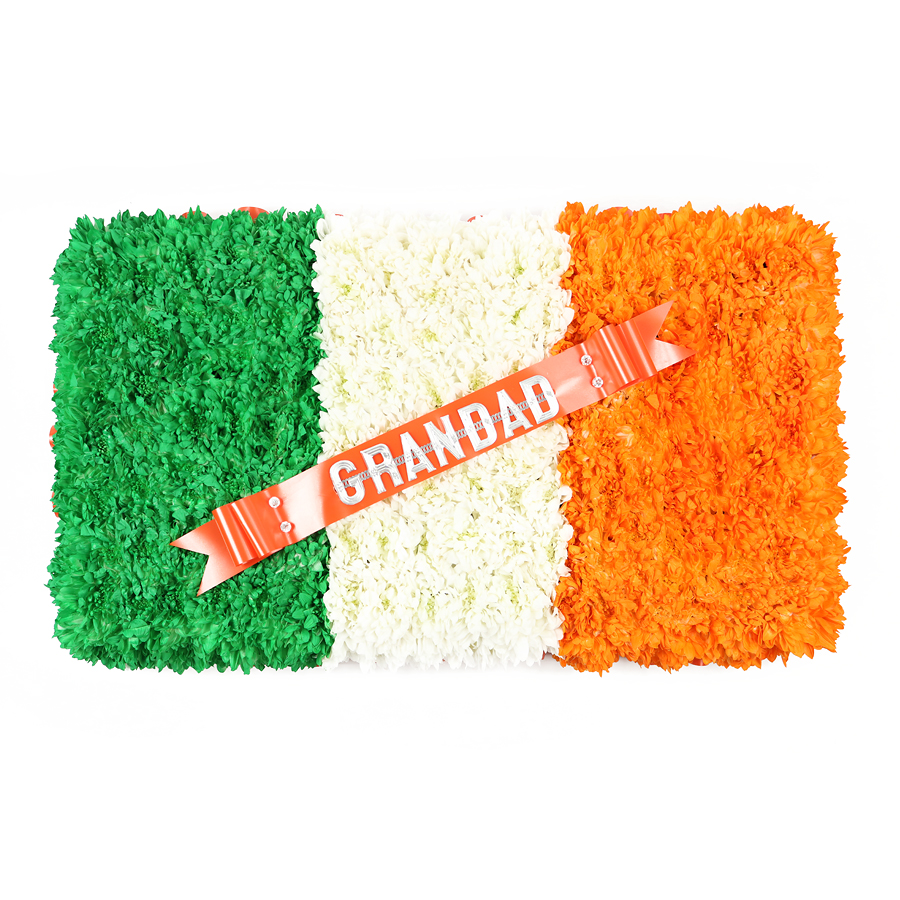 Honor and remembrance with our Ireland Harmony Arrangement. This captivating bouquet features rich green, white, and orange chrysanthemums, artfully arranged to represent the Irish flag and embody peace.
